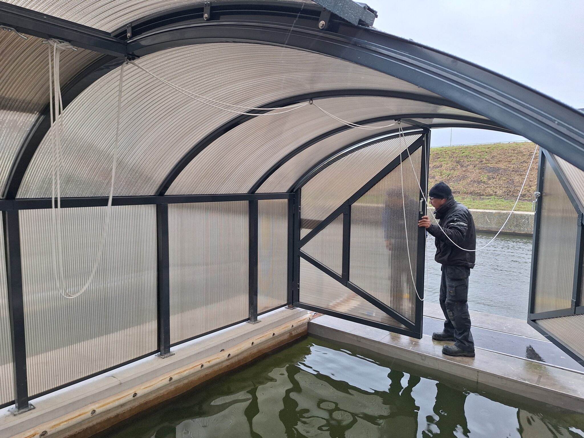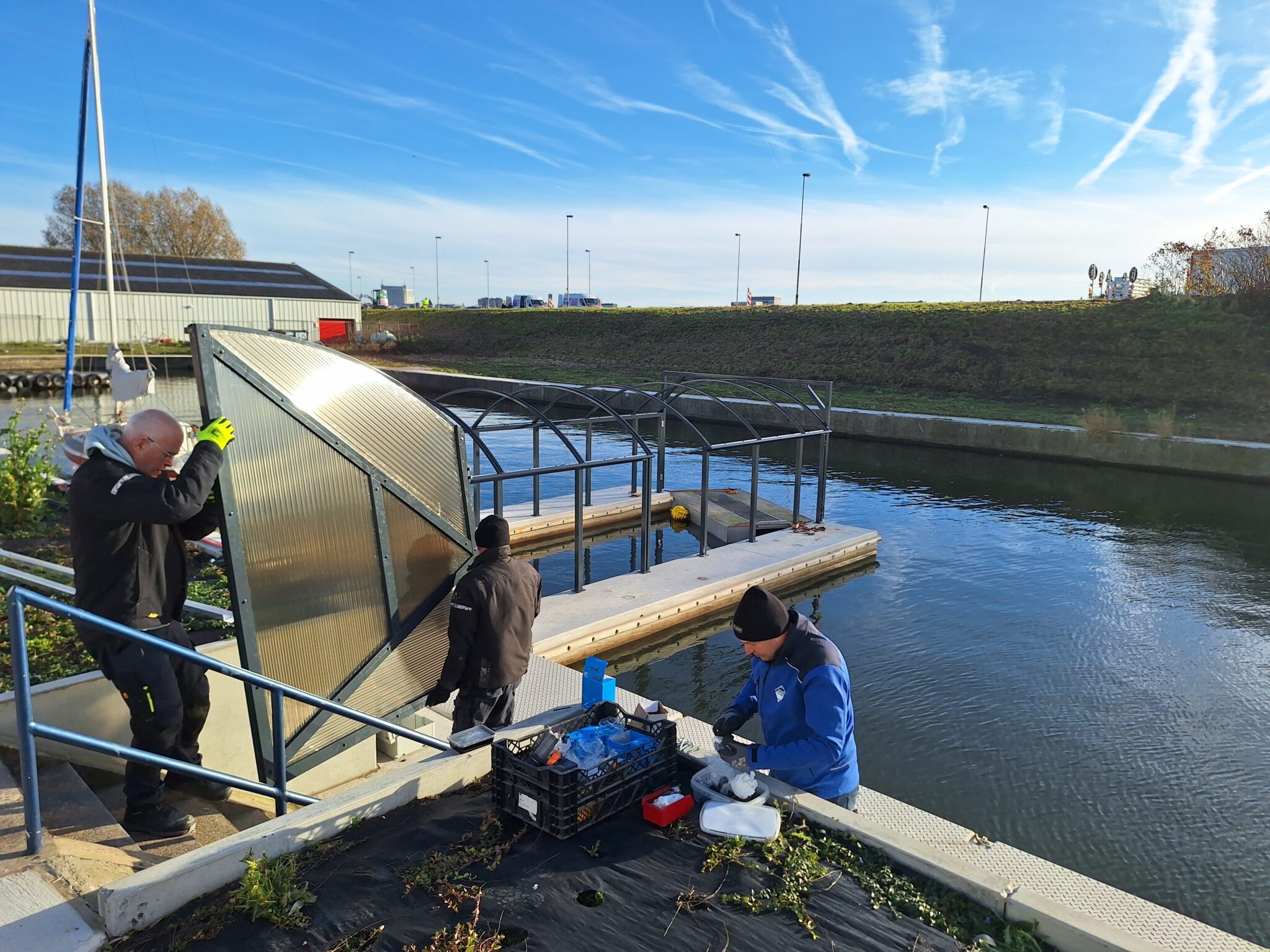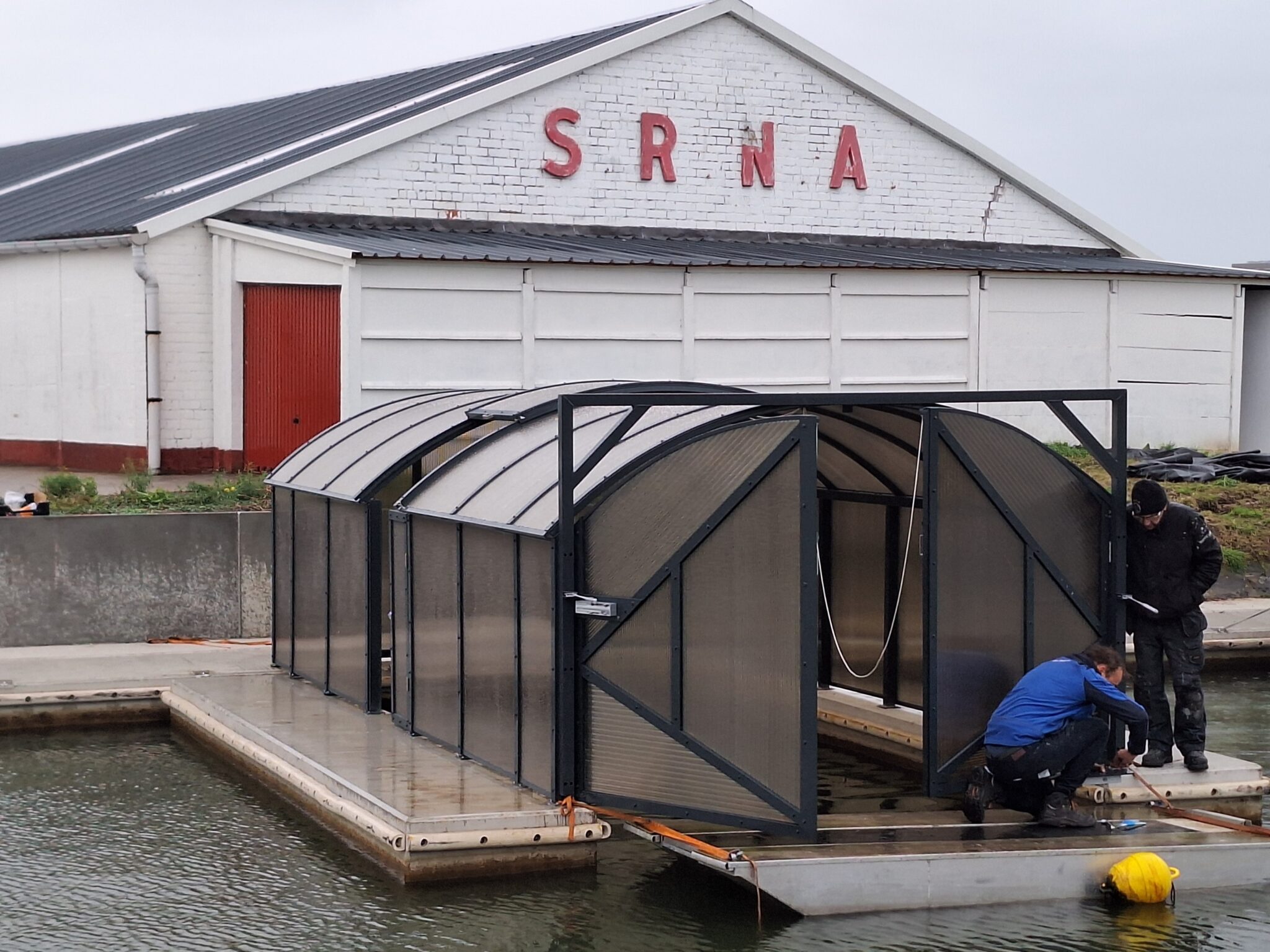 De firma Atlas Acomfa uit Nederland installeert voor SRNA een bootgarage op het Galgenweel.